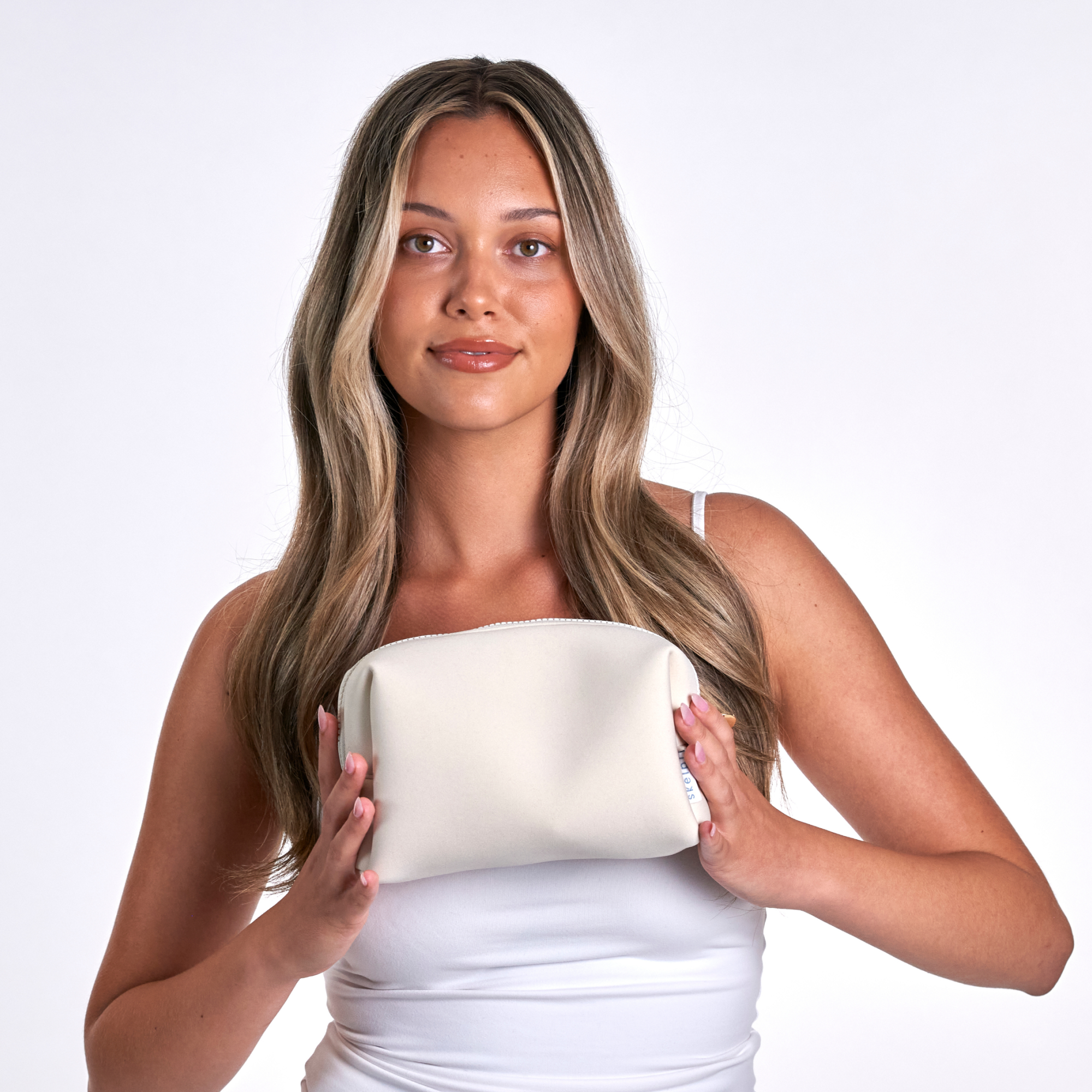 The Mane Bag is designed for flexibility, structured enough to look polished on your bathroom shelf, yet soft and protective for travel. Its neoprene body cushions and supports your products and protected in transit. The wide opening and gold detail make it easy to pack and access your essentials, while the matte cream finish ensures it always looks elevated, whether it’s in your suitcase, gym bag, or displayed at home.